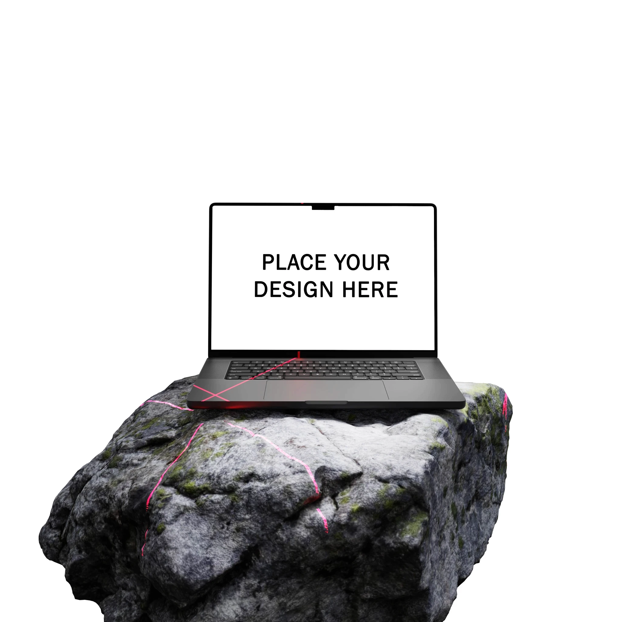 Blender animated mockup of a MacBook Pro on a rocky surface. For product demos, UI showcases, or presentations.