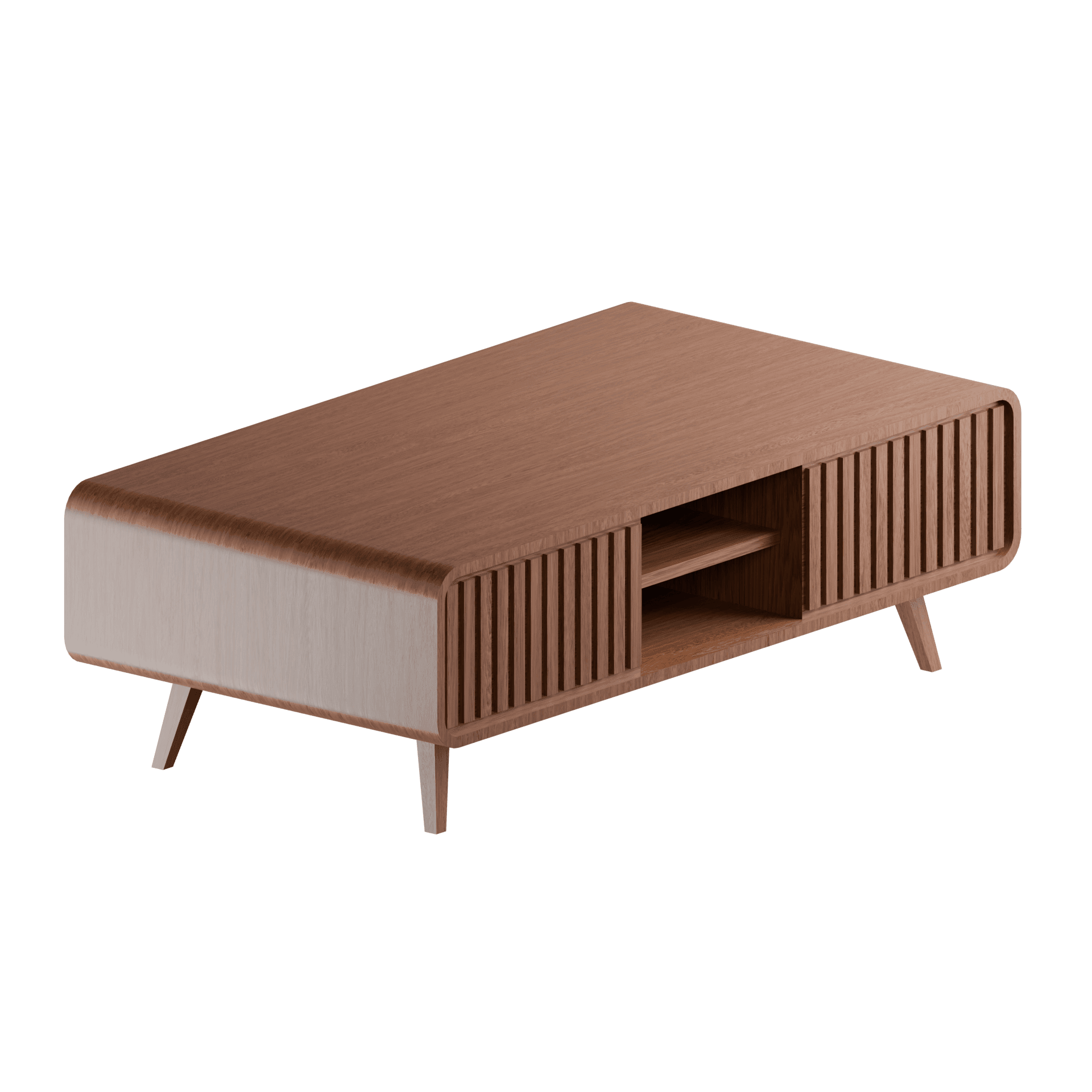 A smooth, curved-edge wooden living room table with open storage and a mid-century look.
