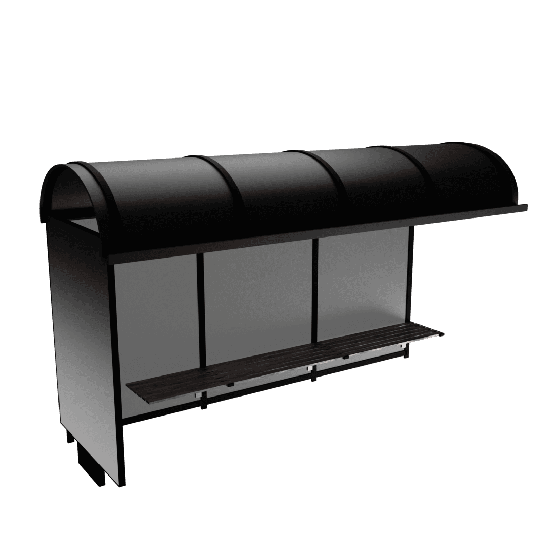 Modern 3D bus shelter with curved black roof, glass shields with a screen at the side, and wooden bench. Perfect for urban scenes in games or renders.