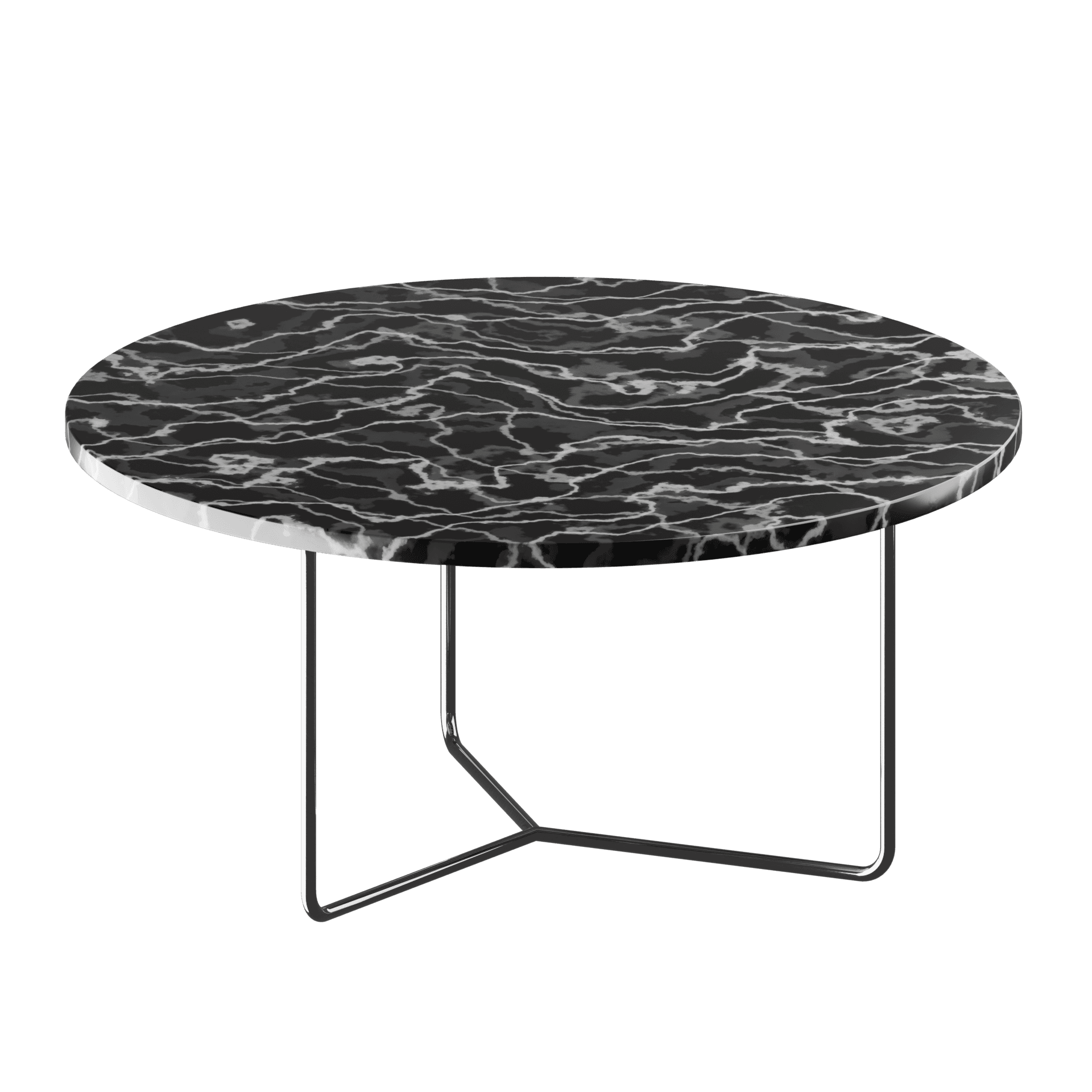 A sleek round coffee table featuring a bold black-marble top and a minimal chrome base.