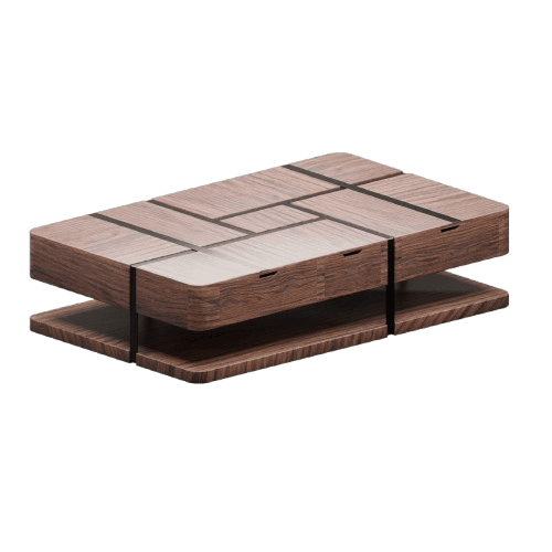 A modern wooden table with geometric panel detailing and a floating dual-layer design, perfect for high-end interior scenes.