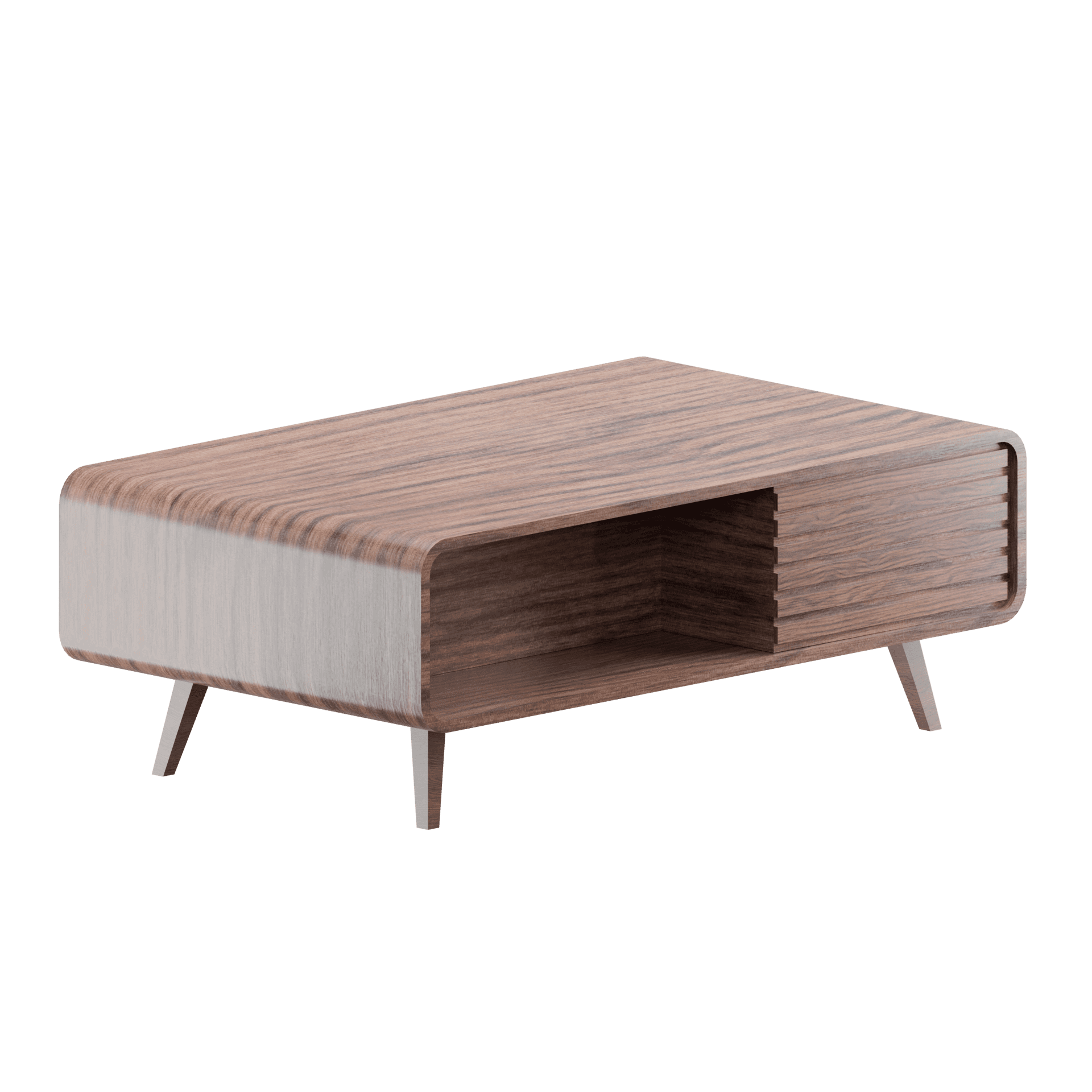 A smooth, curved-edge wooden living room table with open storage and a mid-century look.