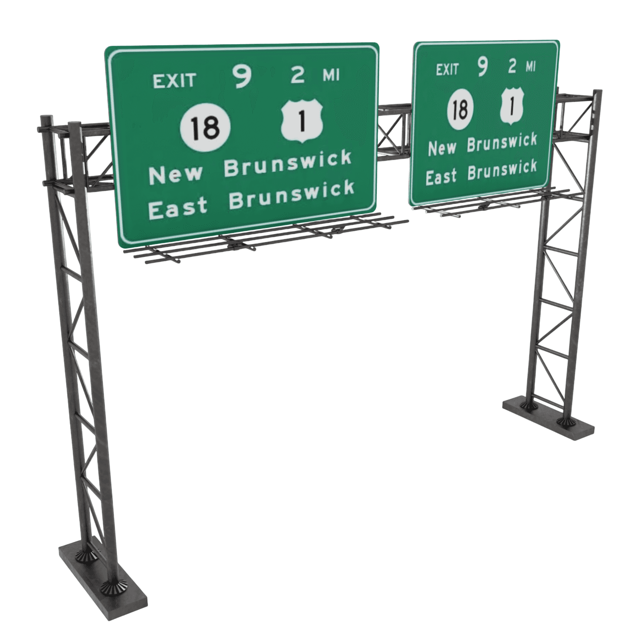 A detailed overhead highway sign with a full metal support structure perfect for road, city, or traffic-themed scenes.