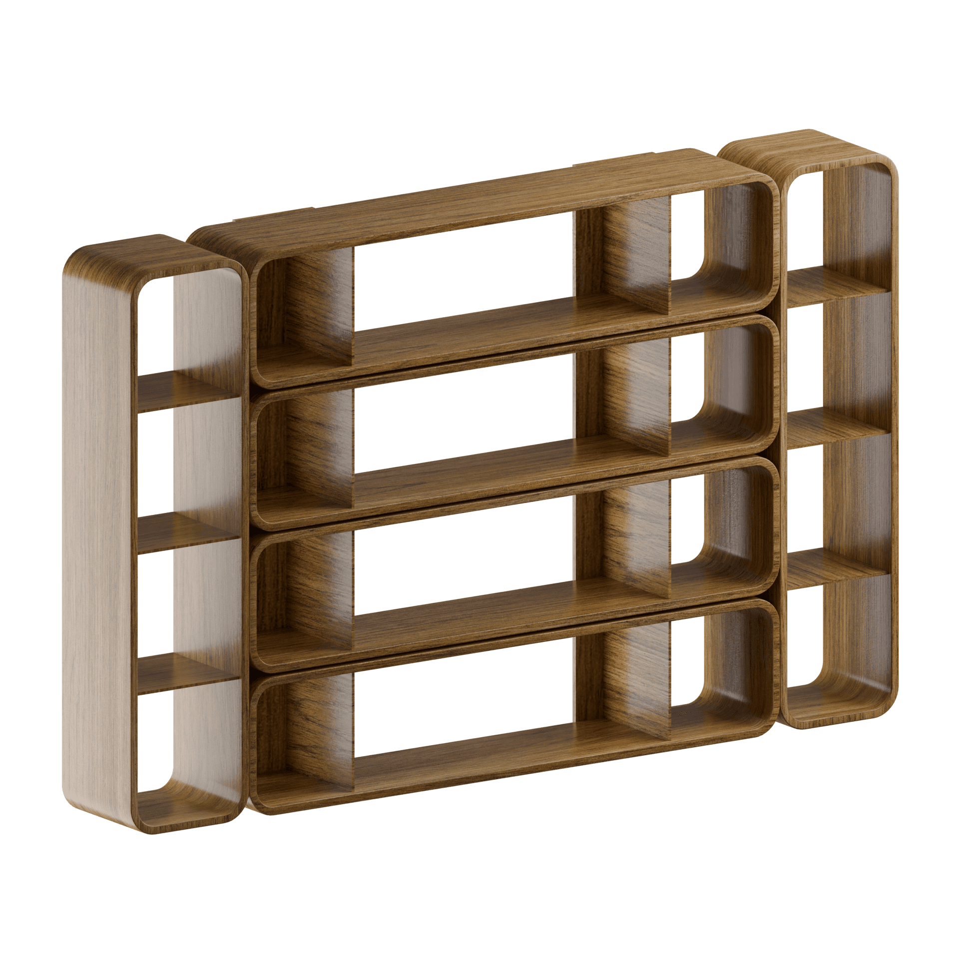 A modern rounded-edge wooden shelf system with multi-level compartments for clean, minimal interiors.