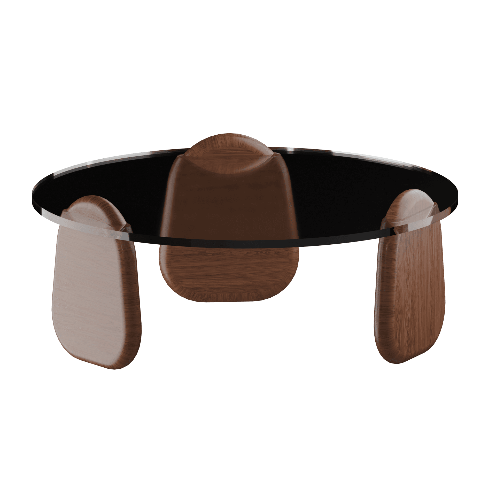 A modern round coffee table featuring a polished glass top supported by three sculpted wooden legs.