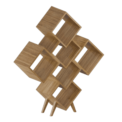 A modern geometric wooden shelf with stacked, rotating compartments for a bold, sculptural look.