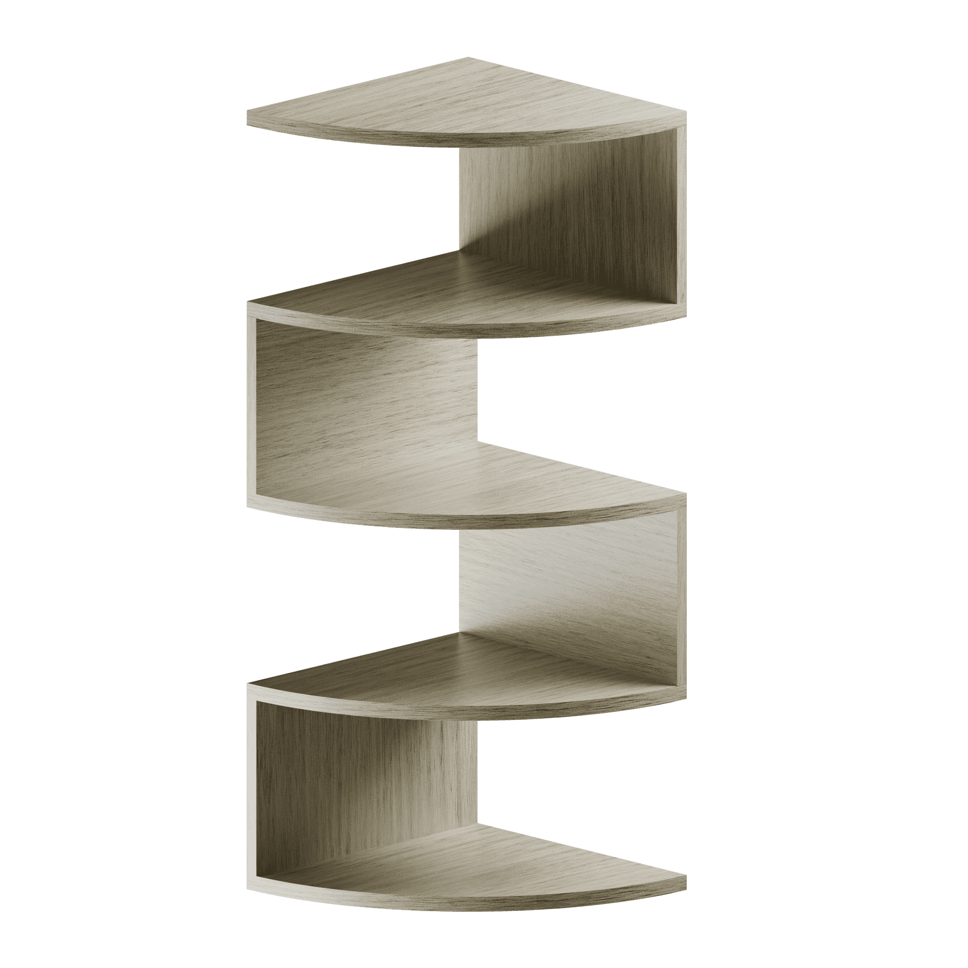 A modern corner shelf with four curved tiers, designed to fit neatly against any wall while adding a smooth, minimalist aesthetic.